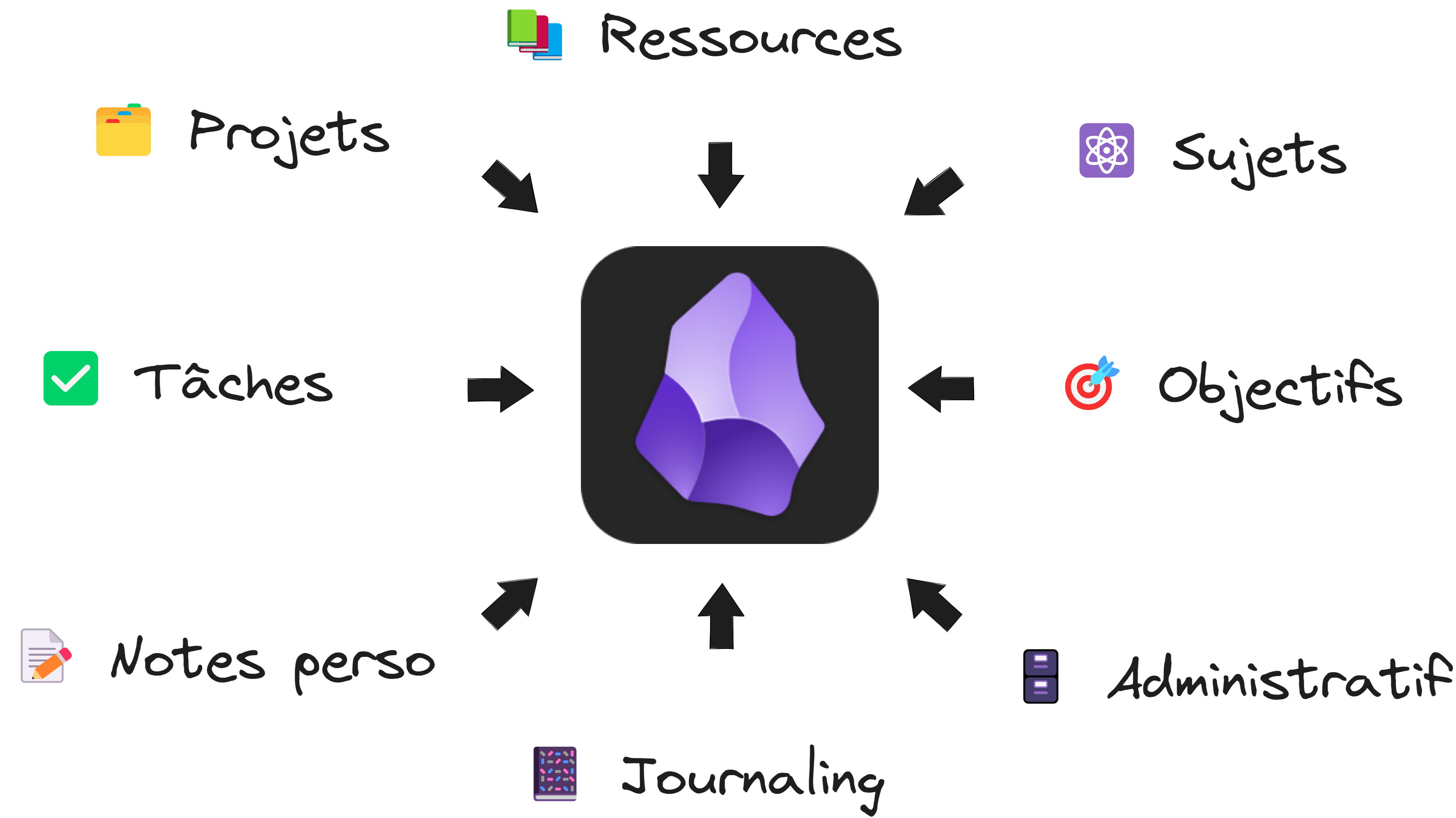 Chaque pilier répond à un besoin précis dans ta maîtrise d'Obsidian. Et ensemble, ils forment un système complet pour gérer tes connaissances comme un expert.