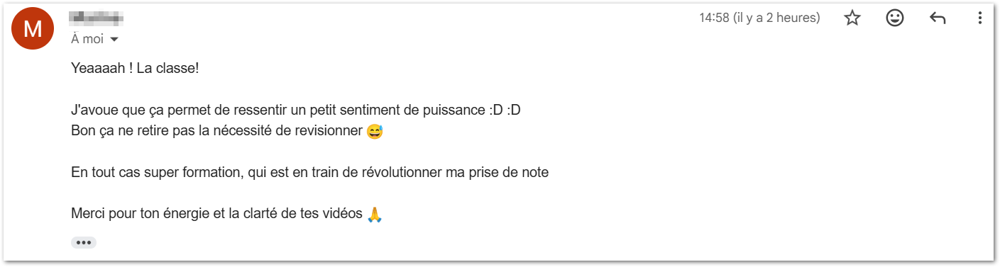 J'ai vu des centaines de personnes passer de "je suis perdu dans mes notes" à "j'ai un système qui me rend plus efficace chaque jour".