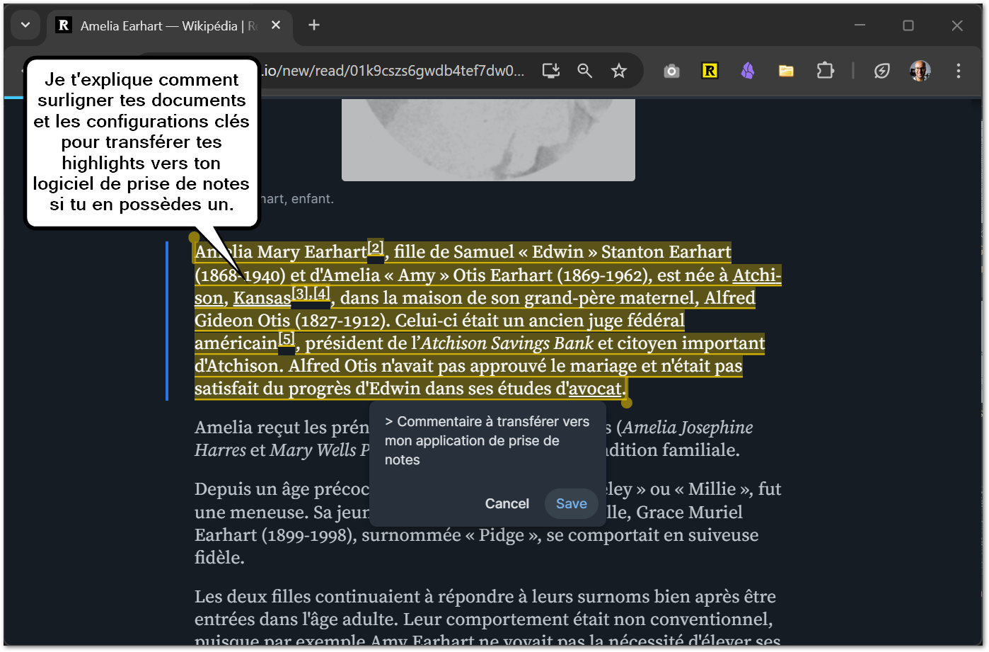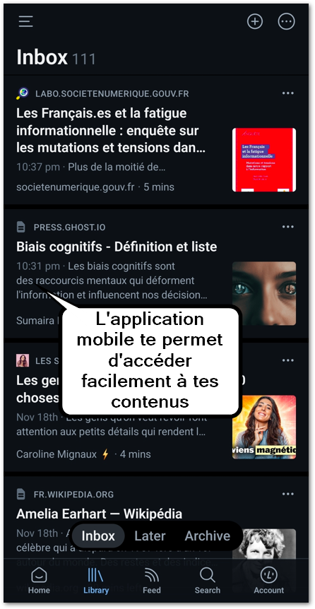 Tu peux sauvegarder ce que tu veux lire plus tard, organiser, filtrer, surligner, commenter… et surtout transformer chaque lecture en une ressource vraiment utile pour tes projets ou ta veille.
