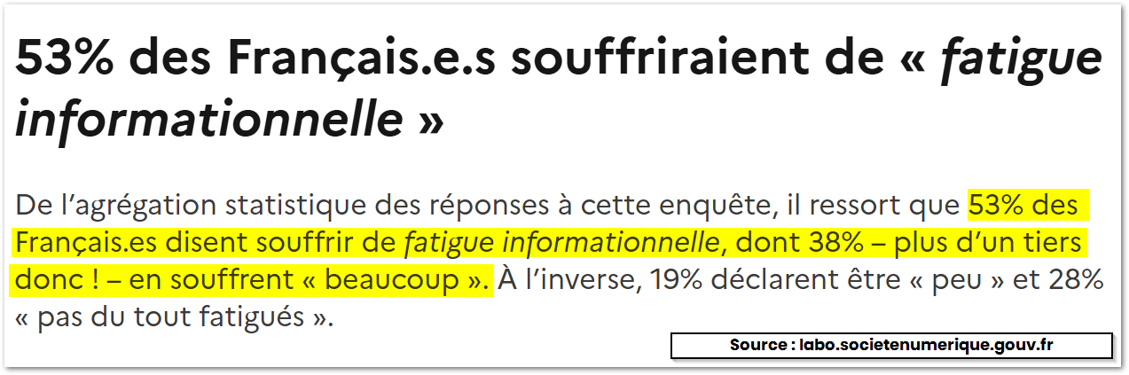 Selon l'étude "Le Français.es. et la fatigue informationnelle : enquête sur les mutations et tensions dans notre rapport à l’information" datant de 2023, 53% des citoyens français souffriraient de fatigue informationnelle.